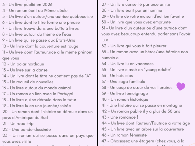 Et c’est reparti pour une année de découvertes et de lectures aventureuses ! Retrouvez nos précédents défis juste ici : https://defilenpage.fr/defi-lecture-2025/ https://defilenpage.fr/defi-lecture-a-partager/ 6. Un livre dont le titre forme une …